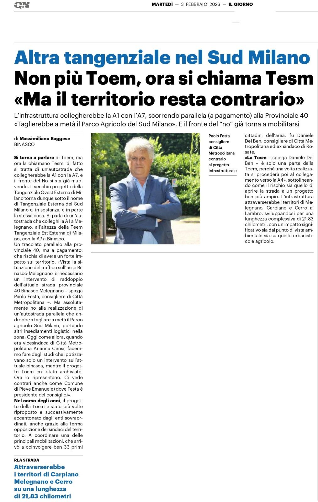 Un tracciato parallelo alla provinciale 40, a pagamento, che rischia di avere un forte impatto sul territorio. "Vista la situazione del traffico sull’asse Binasco-Melegnano è necessario un intervento fattibile come il raddoppio dell’attuale strada provinciale 40 Binasco Melegnano – ho spiegato al giornalista de Il Giorno –. Ma assolutamente no alla fantasiosa realizzazione di un’autostrada parallela alla SP 40. Il sud Milano non ha bisogno di un autostrada a pagamento, che nessuno utilizzerebbe, questa scelta contribuirebbe solo a consumare suolo agricolo e a distruggere il piú importante polmone verde di Milano".