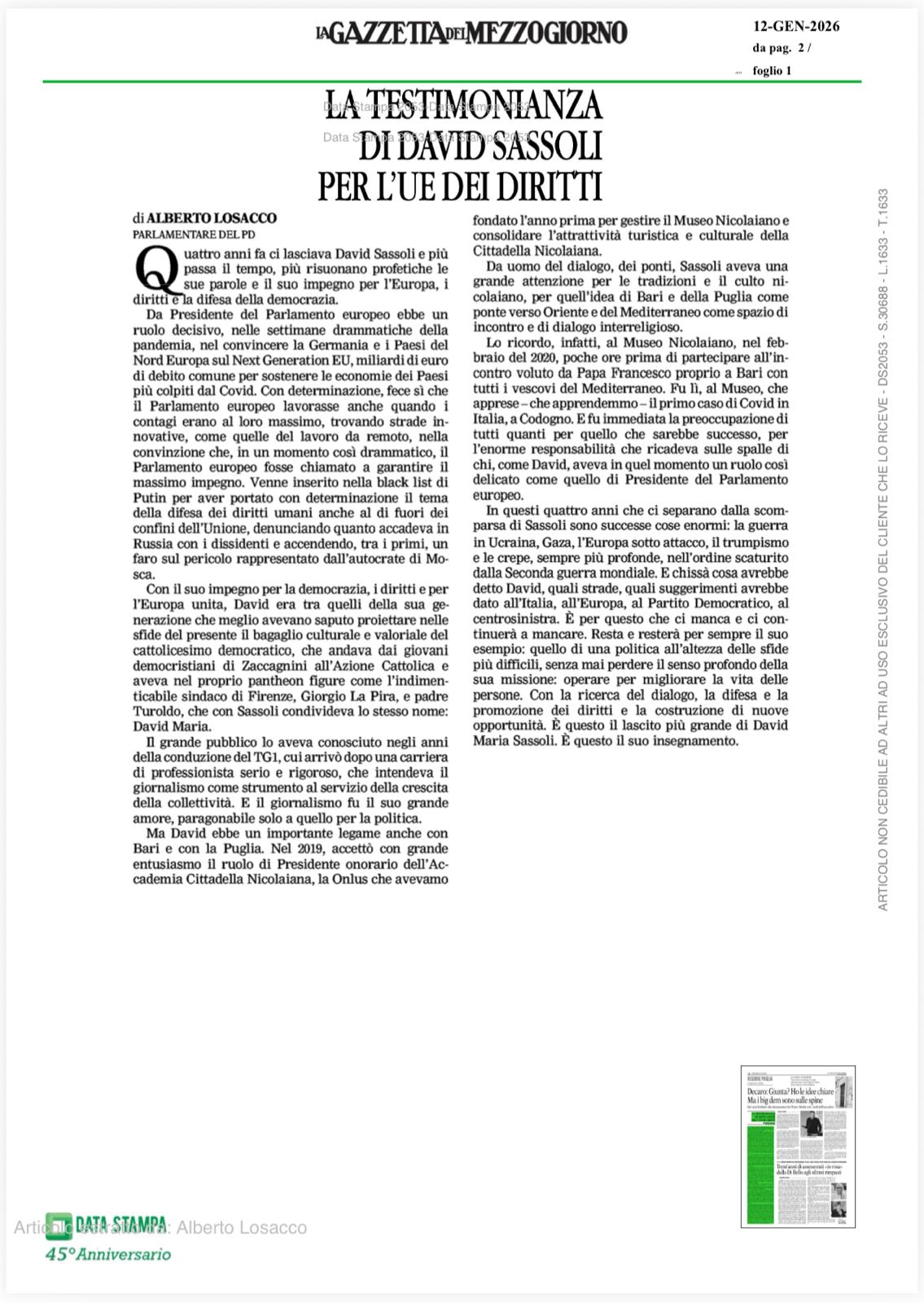 17 Gennaio 2026 Alberto Losacco La testimonianza di David Sassoli per l’UE dei diritti Articolo di Alberto Losacco pubblicato da La Gazzetta del Mezzogiorno. Condividi questo contenuto su : Whatsapp Prec Avanti