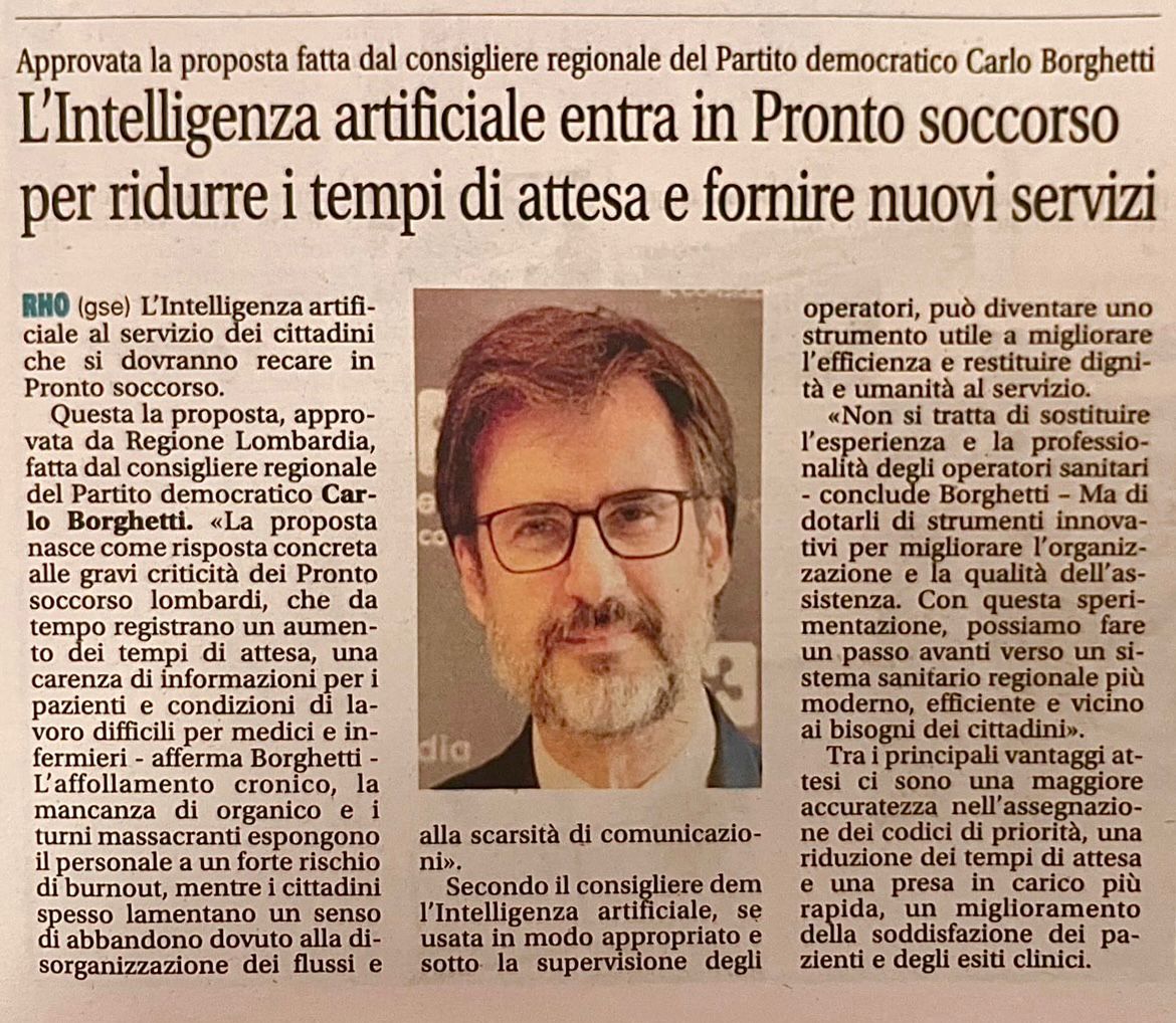 Torno sulla proposta che il Consiglio regionale mi ha approvato all’unanimità a fine luglio, e che il circuito Netweek ha ripreso ancora in questi giorni sui suoi giornali e TV: l’idea consiste nell’avviare in Regione Lombardia una sperimentazione di 12 mesi sull’utilizzo del triage digitale basato sulla IA, l’intelligenza artificiale -supervisionata da personale sanitario- in almeno un presidio per ciascun livello di Pronto Soccorso.